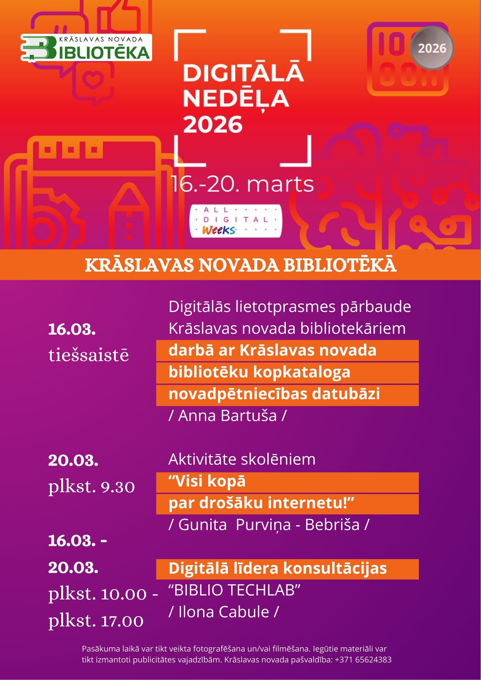 Plašāka informācija par Krāslavas novada bibliotēkas Digitālās nedēļas 2026 pasākumiem ir bibliotēkas tīmekļvietnē un sociālajos medijos.