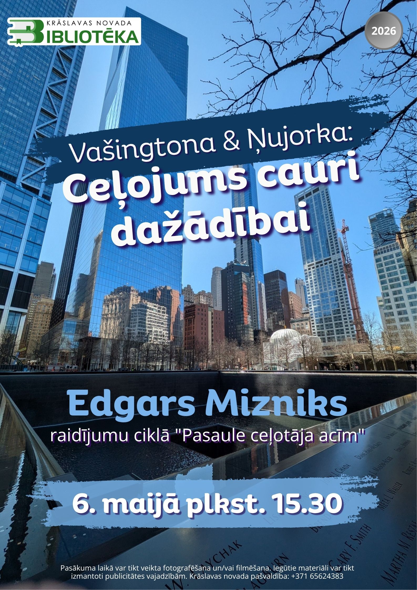 2026. gada gada 6. maijā plkst. 15.30 Krāslavas novada bibliotēkā notiks tikšanās ar Edgaru Mizniku “Vašingtona & Ņujorka: Ceļojums cauri dažādībai” raidījuma cikla “Pasaule ceļotāja acīm” ietvaros.