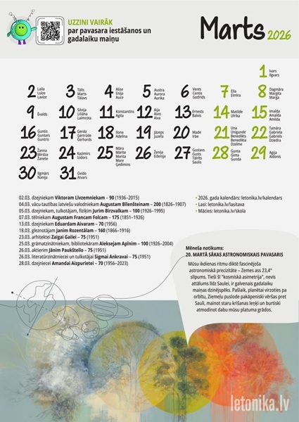 Letonika.lv 2026. gada marta kalendārs 01.03.2026